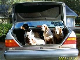The setters always jumped in the trunk when I carried my shotgun to the car. It was a 15 minute ride to some hot wild quail hunting where my hunting jeep was parked. Babe (2nd from right and the mother of Belle) is dead now–she was an outstanding bird finder. In the late 1990s, on a hunt with my 44 years-long friend Wayne Todd, Jr., the finest gun/fisher in North Florida, she pointed 20 coveys of wild quail by herself in one 6 hour hunt. She pointed 16 or more wild coveys on 4 other occasions that year. The fabulous dog man Lee Stuckey stated she was the best setter he had ever seen in the field. She always outhunted my 3 AKC Field Trial Champions, but she had shorter legs and would not have been as good in field trials where “big-running” dogs are the first to the quail and get the “find.” However, in the world of wild birds, Babe was the queen. In the 1998-99 season, she pointed 392 coveys of wild quail. I miss her. She lived to be almost 17 years, extremely long among setters.